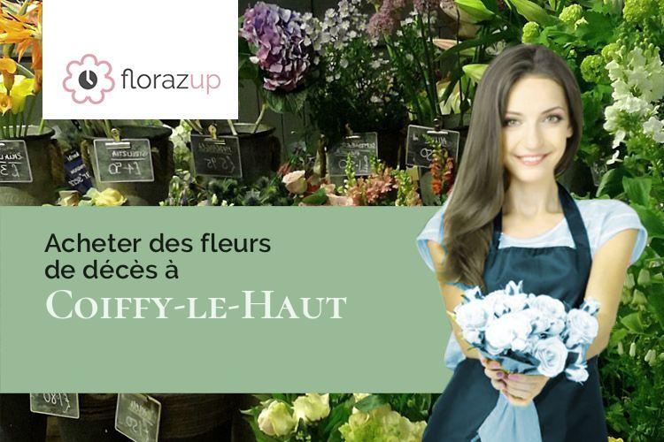 Il est courant chez nous de faire passer un message d'amour à la personne éteinte avec des fleurs d'obsèques. Faire livrer des bouquets d'enterrement à Coiffy-le-Haut (Haute-Marne/52400) pour des obsèques permet également d'amoindrir la tristesse de la famille. Chaque création florale achetée sur le site web pour Coiffy-le-Haut (Haute-Marne/52400) peut être personnalisée en mettant un beau texte de condoléances mais également en mettant un ruban.