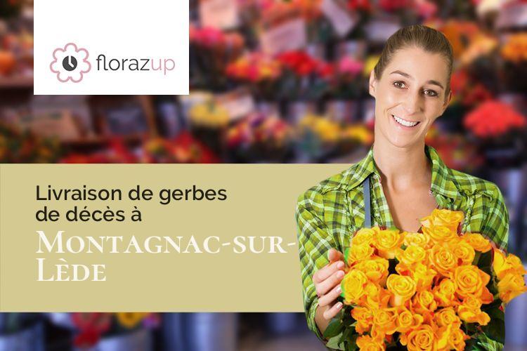 Vous ne pouvez pas aller à Montagnac-sur-Lède (Lot-et-Garonne/47150) pour les obsèques d'un ami, faites livrer des fleurs d'obsèques sans difficulté par un fleuriste de Montagnac-sur-Lède (Lot-et-Garonne/47150). La marketplace Florazup propose des bouquets, croix, coussins, gerbes main, coeurs... pour un décès à des tarifs et des couleurs différentes. La livraison de la composition d'obsèques sera faite au lieu demandé (funérarium, église de Montagnac-sur-Lède (Lot-et-Garonne/47150), chapelle) ; pour livrer à Montagnac-sur-Lède (Lot-et-Garonne/47150) une composition de fleurs d'obsèques le jour des funérailles, vous devrez marquer lors de votre commande les informations suivantes : l'endroit précis de l'enterrement, la date et l'heure. Pour information, les professionnels de la fleur fabriquent leur gerbe de deuil seulement avec des fleurs et plantes fraîches choisies. Vous trouverez ici quelques gerbes de fleurs que www.florazup.com propose en - de 4 heures à Montagnac-sur-Lède (Lot-et-Garonne/47150).
