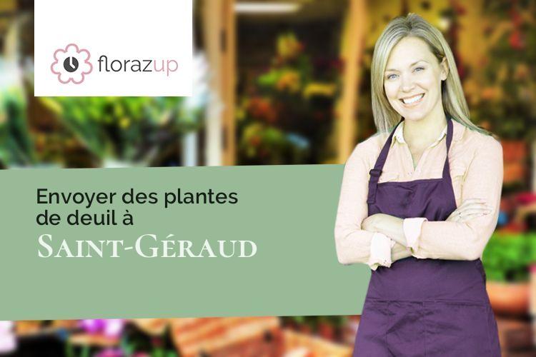 Impossible de vous rendre à Saint-Géraud (Lot-et-Garonne/47120) pour les funérailles d'un ami, faites livrer des fleurs d'enterrement facilement par un artisan fleuriste de Saint-Géraud (Lot-et-Garonne/47120). Le site web propose des bouquets, croix, coussins, gerbes main, coeurs, etc pour un enterrement avec des montants et des couleurs différentes. La livraison de la composition de fleurs sera réalisée à l'endroit demandé (funérarium, église de Saint-Géraud (Lot-et-Garonne/47120), chapelle) ; pour livrer à Saint-Géraud (Lot-et-Garonne/47120) un coeurs deuil le jour des obsèques, vous devrez compléter lors de votre commande les informations suivantes : le lieu précis de l'enterrement, le jour et l'horaire de l'enterrement. Pour info, nos fleuristes travaillent leur bouquet de décès seulement avec des plantes fraîches choisies. Vous trouverez ci-après quelques bouquets de fleurs que www.florazup.com propose en 4h à Saint-Géraud (Lot-et-Garonne/47120).