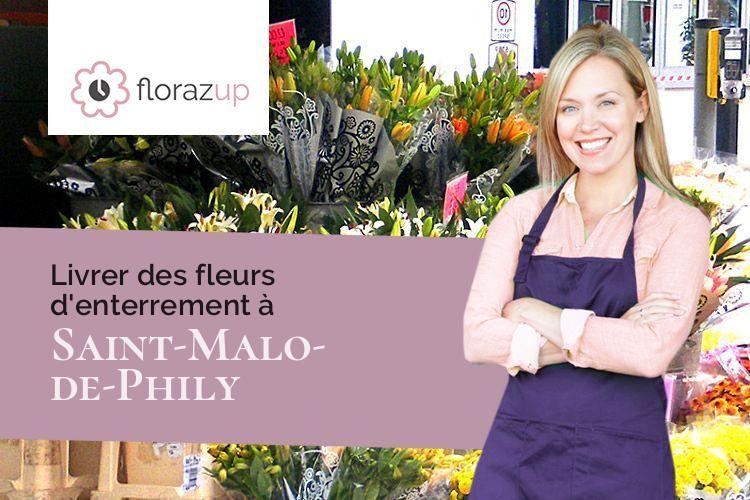 Les associés du site ont une incontestable volonté de faire travailler des fleuristes de Saint-Malo-de-Phily (Ille-et-Vilaine/35480) afin d'assurer une bonne qualité des bouquets d'enterrement commandés. L'artisan fleuriste qui fera la composition de fleurs s'occupera aussi de la livraison au domicile du défunt. L'artisan fleuriste est défini par nos soins ; il est obligatoirement près du lieu de la livraison (donc de Saint-Malo-de-Phily (Ille-et-Vilaine/35480) ou de la ville la plus près).
