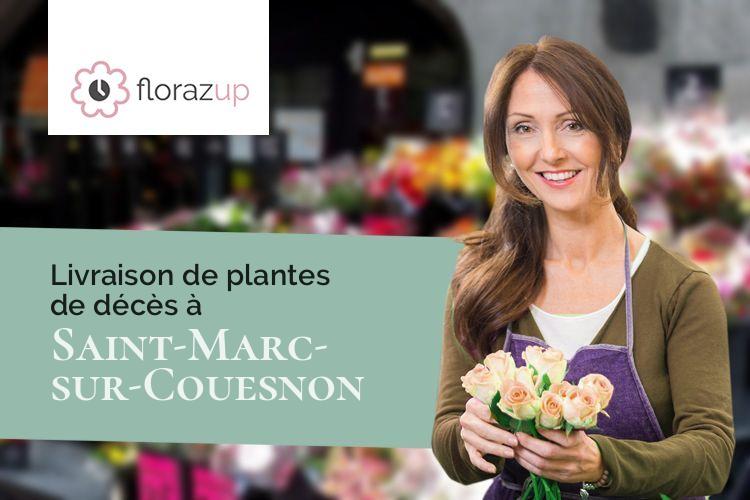 Vous ne pouvez pas aller à Saint-Marc-sur-Couesnon (Ille-et-Vilaine/35140) pour les obsèques d'une amie, livrez des fleurs de deuil en express par un partenaire fleuriste de Saint-Marc-sur-Couesnon (Ille-et-Vilaine/35140). Le site Florazup propose des bouquets, croix, coussins, gerbes main, coeurs... pour un décès à des montants et des couleurs différentes. La livraison de la composition de fleurs sera faite à l'endroit demandé (funérarium, église de Saint-Marc-sur-Couesnon (Ille-et-Vilaine/35140), chapelle) ; pour livrer à Saint-Marc-sur-Couesnon (Ille-et-Vilaine/35140) une composition le jour de l'enterrement, vous devrez compléter lors de votre commande les données suivantes : l'endroit exact de l'enterrement, le jour et l'heure. Pour information, les fleuristes travaillent leur bouquet de deuil uniquement avec des plantes fraîches sélectionnées. Vous trouverez ci-dessous des compositions florales que la plateforme propose en moins de 4h à Saint-Marc-sur-Couesnon (Ille-et-Vilaine/35140).
