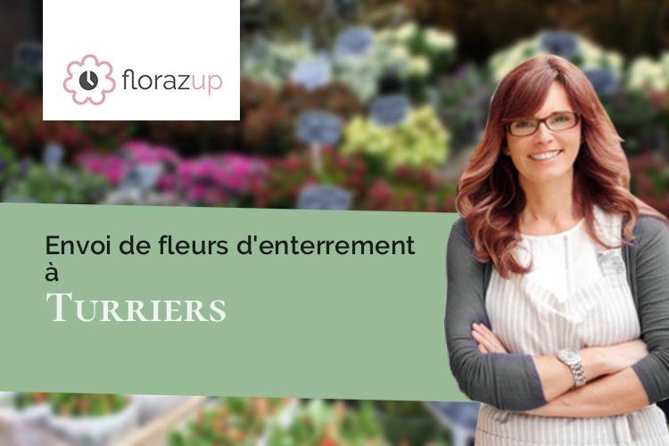 Vous ne pouvez pas aller à Turriers (Alpes-de-Haute-Provence/04250) pour l'enterrement d'un ami, livrez des fleurs d'obsèques facilement par un partenaire fleuriste de Turriers (Alpes-de-Haute-Provence/04250). Le site Florazup propose des bouquets, croix, coussins, gerbes main, coeurset d'autres compositions florales pour une cérémonie d'obsèques à des tarifs et des couleurs différentes. La livraison des fleurs sera réalisée au lieu demandé (funérarium, église de Turriers (Alpes-de-Haute-Provence/04250), domicile de la personne décédée) ; pour livrer à Turriers (Alpes-de-Haute-Provence/04250) un coussin le jour des funérailles, il faudra indiquer lors de votre commande les données suivantes : l'endroit exact de la cérémonie, le jour et l'horaire des obsèques. A savoir, nos fleuristes fabriquent leur composition d'obsèques uniquement avec des plantes fraîches sélectionnées. Vous trouverez ci-dessous quelques compositions florales que le site web propose en moins de 4h à Turriers (Alpes-de-Haute-Provence/04250).